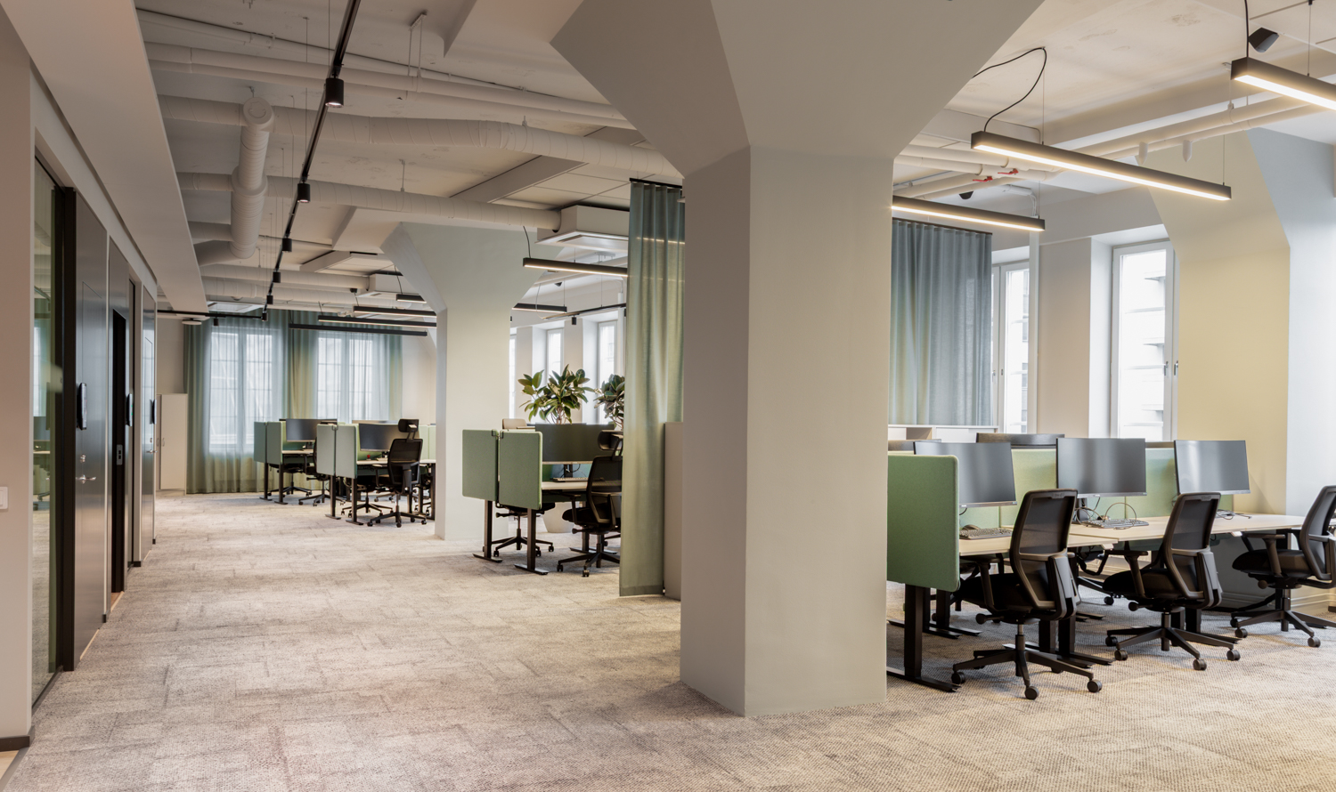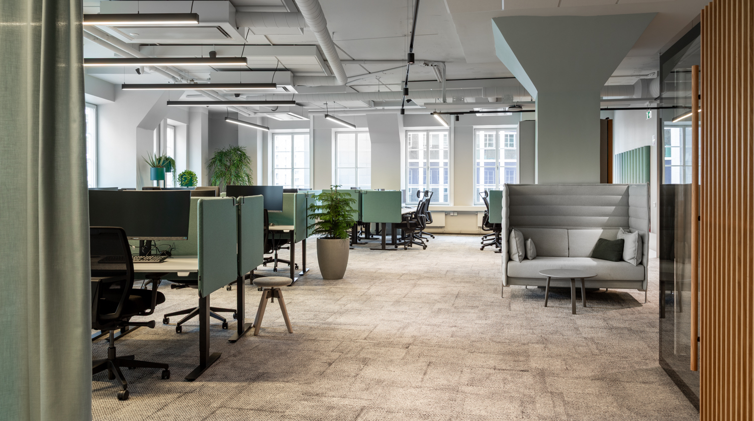 Till stativen valdes ljusgrå bordsskivor, och arbetsstationerna kompletterades med Selma bordsskärmar. På så vis kunde man sitta lite trängre utan att tumma på den personliga sfären och arbetsron.